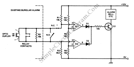 Unlike other alarm circuit that provide normally-open only or normally-closed only configuration, this alarm circuit work for both configurations. The mechanism of this alarm circuit is very simple, that the output will be active (Q1 transistor will be conducting) if IC1 or IC2 “high”. If R2 is open, then IC1 output will be high since the non-inverting input voltage will be tied to V++. At this condition, IC2 will be low but it’s fine since the output of IC2 is connected through a diode to prevent ground short. If R2 is shorted then the voltage at pin 3 IC2 will go higher than the voltage at pin 2, so the output of IC2 will be high. At this time the output of IC1 will be low, but again, a diode (D1) will prevent the output to get shorted. Here is the schematic diagram of the circuit: